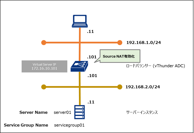 ここでは、クライアントのIPアドレスをNAT機能でロードバランサー(vThunder ADC) のIPアドレスへ変換する場合の設定方法を紹介します。
