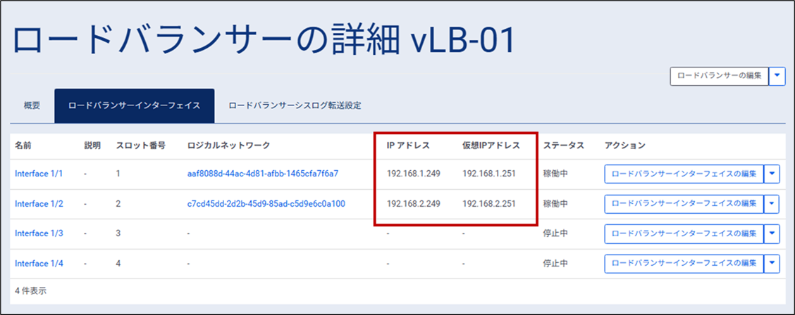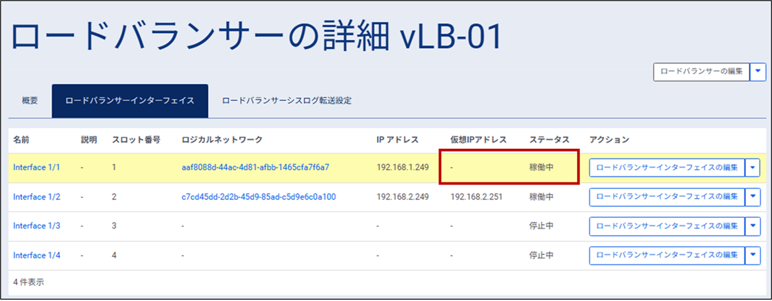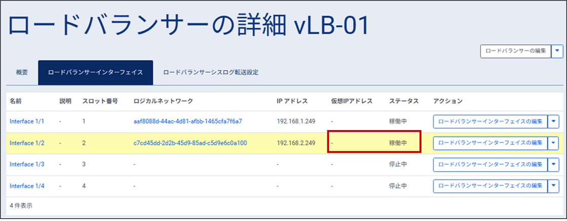 ⑨ ロードバランサーインターフェイス画面が表示されるため、「Interface1/2」の仮想IPアドレスに「-」と表示され、ステータスが「稼働中」となっていることを確認します。