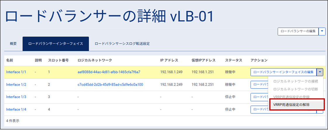 ④ インターフェイス「Interface1/1」のアクションから[ロードバランサーインターフェイスの編集]のプルダウンメニューを開き、[VRRP用通信設定の解除]をクリックします。
