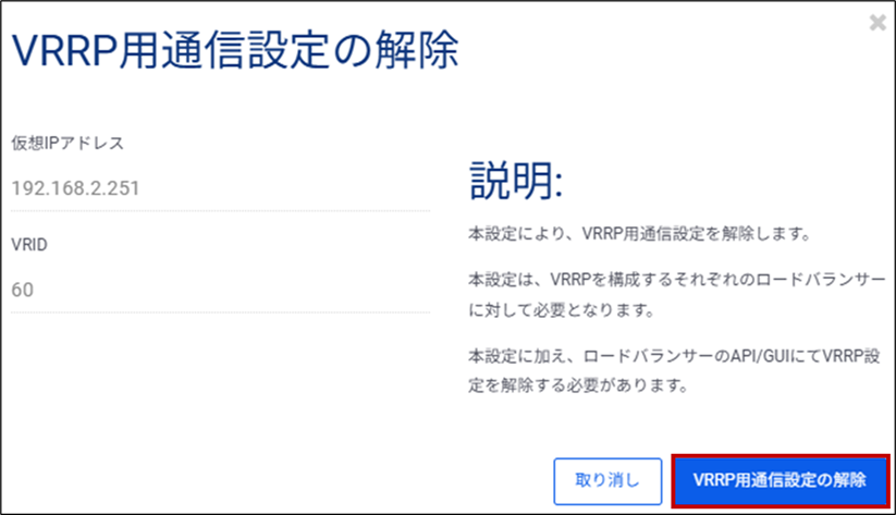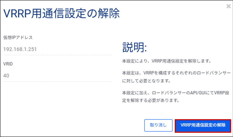 ⑤ VRRP用通信設定の解除画面が表示されるため、[VRRP用通信設定の解除]ボタンをクリックします。