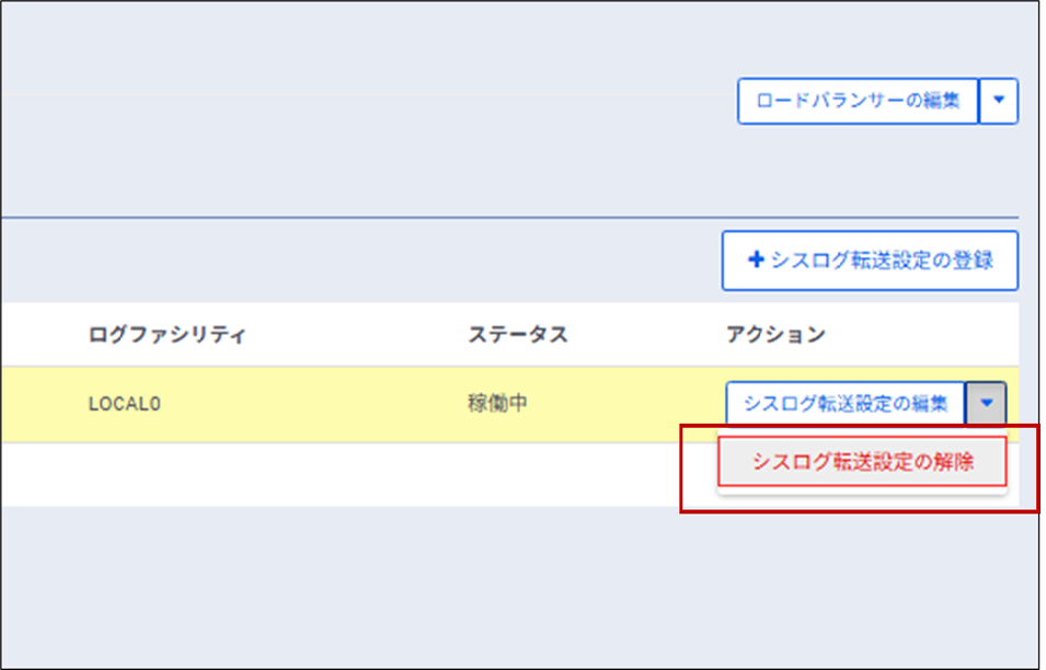 ③ シスログ転送設定を解除します。[シスログ転送設定の編集]の右側の[▼]をクリックして[シスログ転送設定の解除]を選択してください。