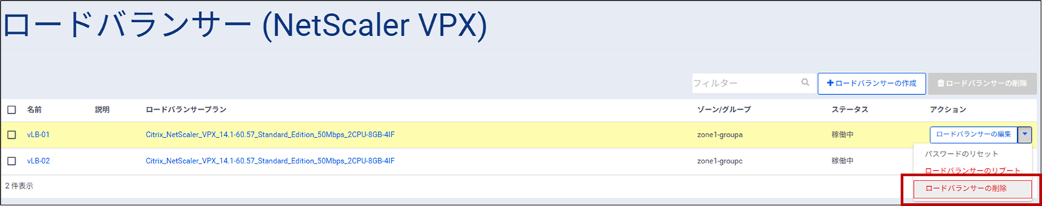作業対象のロードバランサーのアクションプルダウンメニューから[ロードバランサーの削除]をクリックします。(vLB-01・vLB-02で同様の作業を行います。)