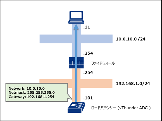 ロードバランサー(vThunder ADC)にて、宛先ネットワークアドレス(10.0.10.0/24)への通信はNext-hopとして「192.168.1.254」を指定します。